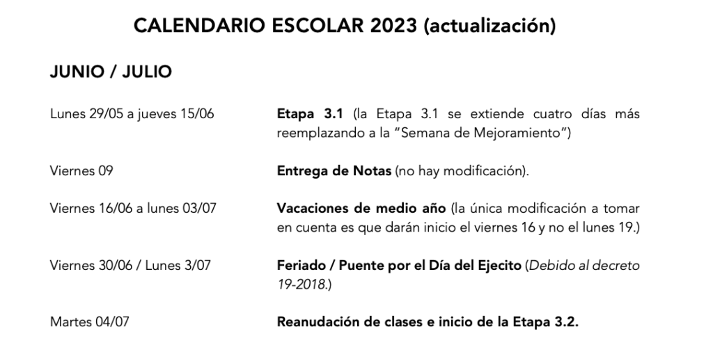 A continuación, compartimos con ustedes cómo quedará el Calendario Escolar con la extensión de la Etapa 3.1 (cuatro jornadas más, en horario normal) y el período de vacaciones.