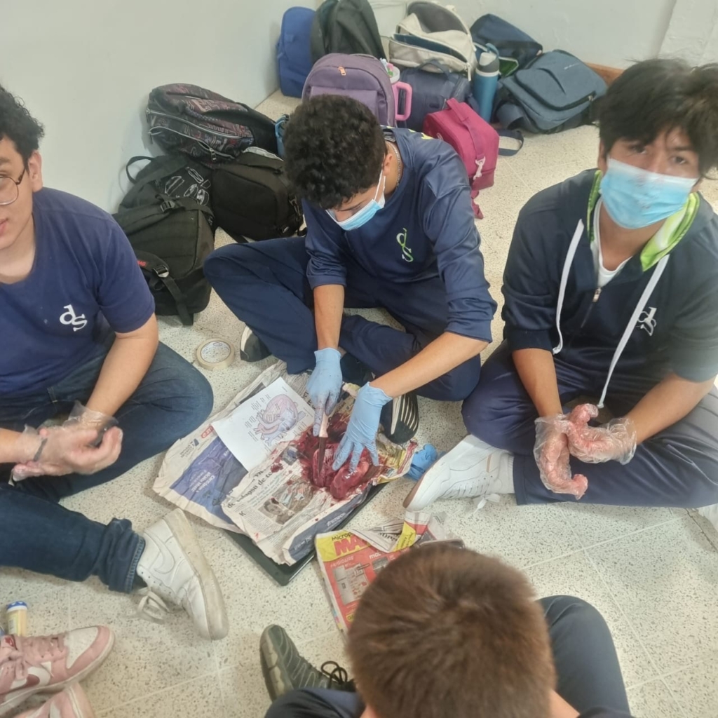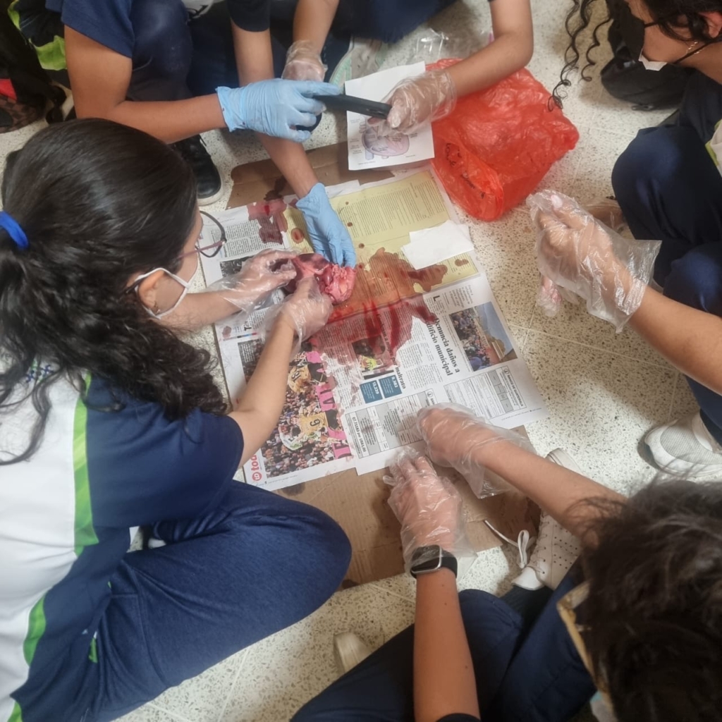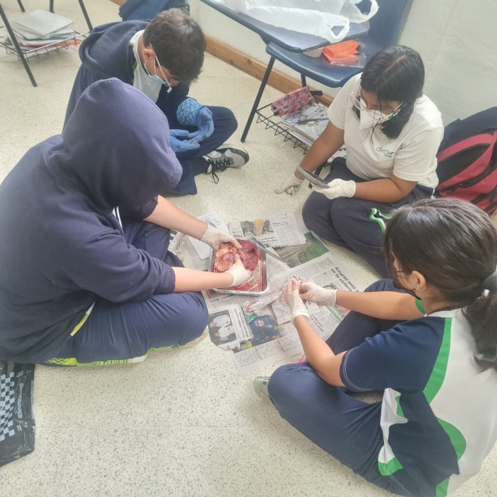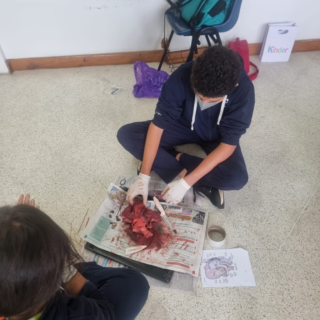 Los estudiantes de segundo básico realizaron la disección de un corazón de cerdo utilizando un corte longitudinal. Esta práctica les permitió explorar la anatomía externa e interna del órgano, identificar sus cuatro cámaras y observar el funcionamiento de las válvulas que impulsan la sangre venosa y arterial dentro del sistema circulatorio.