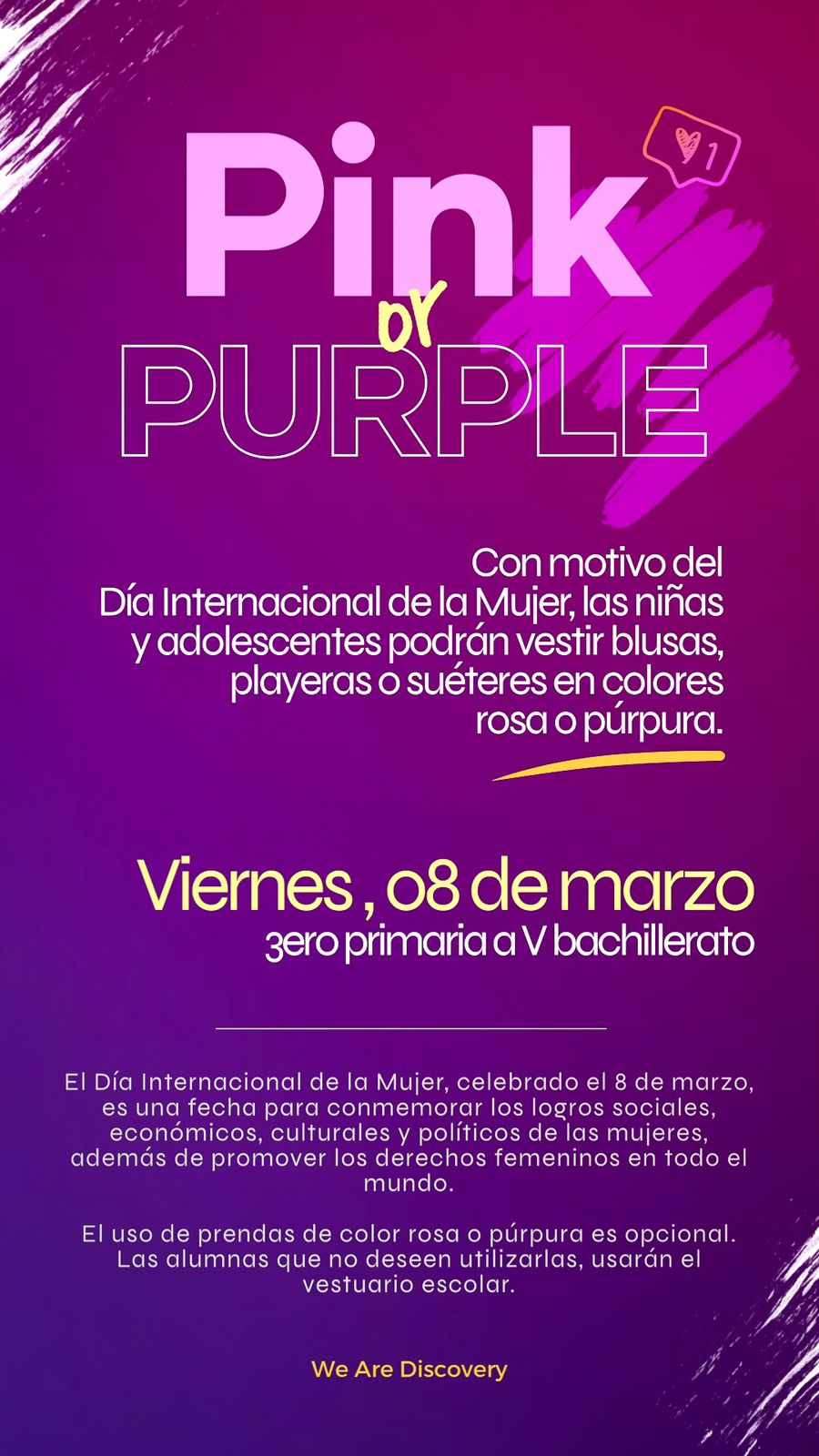 Prendas color rosa o púrpura en ocasión del Día Internacional de la Mujer – Primaria y Secundaria Category Circulares y Noticias del Colegio News, Information & EventsPosted on:March 7, 2024